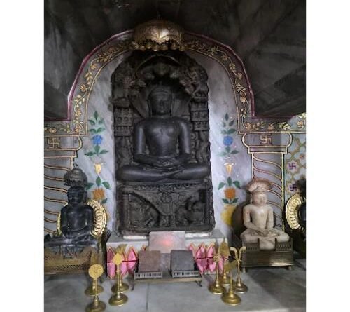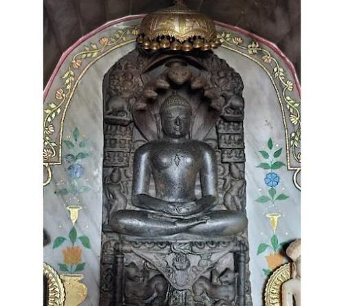 The idol has been identified as Lord Parshvanath based on the seven hoods of snakes carved in the background. The eyes are beautifully carved in a meditative posture (deep in meditation). The statue’s beauty. The statue sits on a carpet atop a pedestal on which two beautiful lions are carved. The back of the statue is carved with serpents intertwined with their hoods. On either side of the statue are carvings of Indra, below which are carved figures of divine beings kneeling in reverence to the god. Below the divine carvings, on the left and right sides of the pedestal, are carved smaller statues of Yakshas (Dharanendra) and Yakshinis (Padmavati Devi). Above the Indras are carved smaller statues of the 18 Tirthankaras (three in each row, nine on either side), On which statues of elephants carrying divine instruments (holding musical instruments and flower garlands in their hands) are engraved. Above these carvings are carved the remaining statues of the 6 Tirthankaras (3 on each side) with the Chhatra (divine three-layered umbrella) and Ashoka tree carved on them.