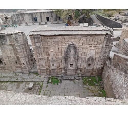 The Fort: The Fort is built on a narrow strip of a hill feature at the confluence of two rivers, Ban Ganga and Manjhi (also called Patel Ganga) the hill has sides, with a sheer drop of about 400 fits to the riverbed. The Kangra Township lies to the Northeast. The hill feature on which the fort is located is connected to the township by an isthmus about 50m wide. The topography imparts role in the long uninterrupted rule of Katoch King in the area down to the medieval times. Presently, the fort contains only scattered ruins of the Jain temples and a surprisingly intact large jain idol of Lord Adinath. The idol is carved in dark gray stone with locks of hair falling on shoulders on either side. Its size is (39.5x31x17.5) with symbol of the “bull” engraved on the seat.The entire fort was declared a “protected monument”in 1909.