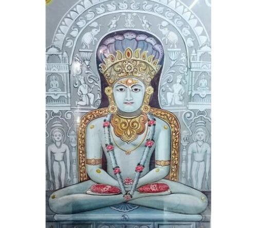 many temples here which were destroyed during the Muslim invasion. Many temples were converted into Mosques. The idol of Dokadiya Parshvanath, which is very impressive and miraculous, is beside the idol of Chandraprabhu Swami. There is a story behind the name Dokadiya Parshvanath. A Shravak, who was the first person to do Pooja of Dokadiya Parshvanath daily, used to find a “Dokada” (currency of that period) in the palms of Bhagwan daily. This incident continued for many days. One day he told about this incident to another person. The next day, the dokada was there but it got stuck in the palm of Bhagwan and even today we can see the coin in the palms of Bhagwan. Hence, this Parshvanath came to be known as “Dokadiya Parshvanath”. This Parshvanath is also known as “Dada Parshvanath”. The devotees have great faith in this miraculous and influential idol of Dokadiya Parshvanath. In the basement of this temple, there is a temple of 45 Agams (the main scriptures of Jainism). All the Agams are beautifully written on copper plates.