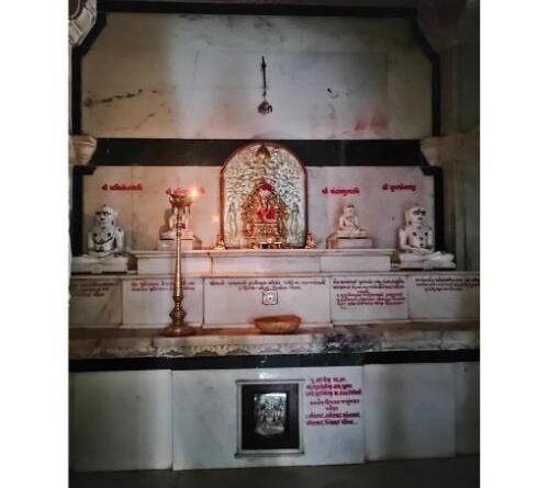 This temple is located at Akhi Doshi Pole. The beautiful and miraculous metal idol of the main deity, Parshvanath, is adorned with Panchtirthi and entourage. The inscription on the back of the enclosure is dated 1110 AD. The enclosure is very beautiful. This temple is two stories tall.