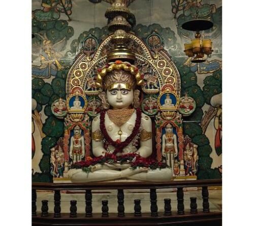 The main deity is Lord Dharamnath. Approximately 153 cm tall, the white idol of Shri Suraj Mandan Parshvanath is in the Padmasana posture. A nine-hooded umbrella rests above the idol’s head. This idol is located in the basement of the Shri Dharamnath Temple, known as the “Haathiwala Temple.”