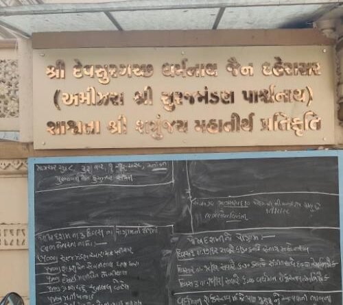There are several Jain temples here, and most of them are ancient. This idol of Shri Suraj Mandan Parshvanath was consecrated in 1679 AD by the virtuous hands of Shri Ratnachandra Gani, a disciple of Shri Shanti Chandra Upadhyay, on the 5th day of the month of Kartika in the Punarvasu nakshatra. Gopidas Shresthi had this beautiful idol of Lord Parshvanath installed. Therefore, this important area where the temple is located is known as “Gopipura” after Gopidas Shresthi. The idol of Shri Dharamnath Bhagwan was installed by the revered hands of Acharya Shri Hirvijaysurishwarji* on the 5th day of the dark half of the month of Jeth in V.S. 1664. This temple is also known as the “Haathiwala Temple.” Shri Vastupal Omji built a Guru Mandir here called “Hir Vihar” and installed the footprints of Shri Hirvijaysurishwarji and Shri Sensurji. This idol of Suraj Mandan Parshvanath is miraculous, impressive, attractive, magnificent, and always smiling. If worshipped with great faith and devotion, the devotee’s wishes are fulfilled. Knowing this, Shri Shantidas Sheth chanted the “Shri Chintamani Mantra” in front of this idol of Shri Suraj Mandan Parshvanath.