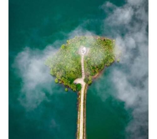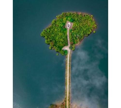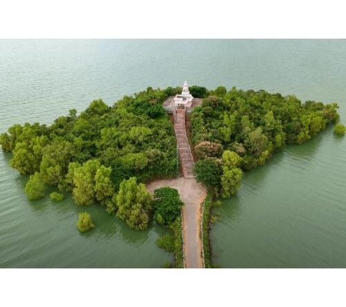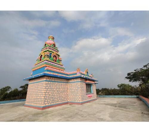 Recently constructed temple on an island connected by a small road to mainland.  The temple is renovated recently with some amenities Area, Foot steps, Temple wall and sitting area.